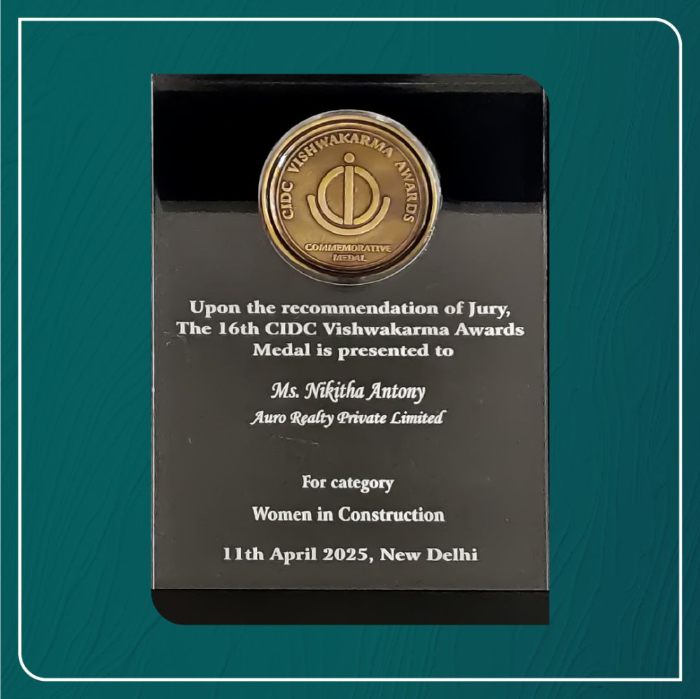 Auro Realty Sets a New Benchmark in Inclusivity at CIDC Vishwakarma Awards. Auro Realty is proud to be recognized yet again as a brand that champions progressive values and drives meaningful change within the construction industry. At the prestigious 16th CIDC Vishwakarma Awards held at Dr. Ambedkar International Centre, New Delhi, our team member Nikitha Antony was conferred the "Women in Construction Achievement Award", a testament to our unwavering commitment to nurturing talent beyond boundaries. This accolade recognizes Nikitha’s exceptional perseverance, drive, and commitment to making a career in traditionally male dominated construction industry and her choice to work shoulder to shoulder on-site as Site Engineer. We believe, foundation for this achievement was laid by her several years ago when she passionately pursued her degree in Civil Engineering. Her charismatic approach and dedication have inspired us and reinforced our belief on hiring more and more women for our construction sites.